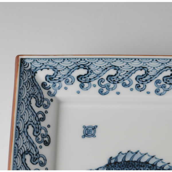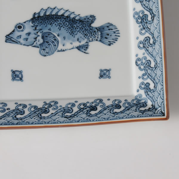 平戸松山窯の「魚紋正角皿」です。濃い目の筆使いで描きます。愛くるしい魚の目が印象的な紋様です。