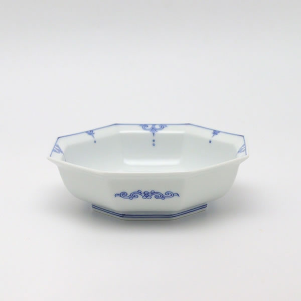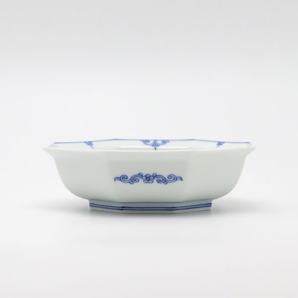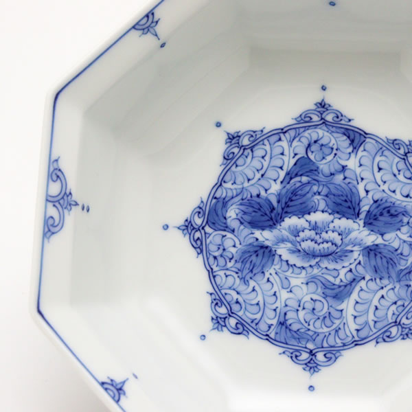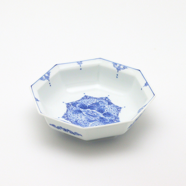 平戸松山窯の「間取牡丹唐草八角向付」です。細かく、しなやかな筆使いで、牡丹と唐草を描き、白磁の白さが優しく感じる作品です。