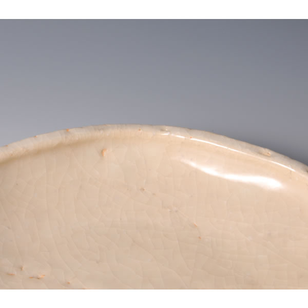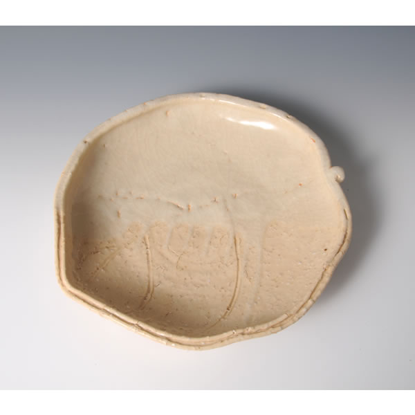 玉村登陽 作 「鬼萩葉形皿」です。登り窯で焼成しました。大粒の荒砂を混ぜた荒土で作った、鬼萩の豪放な皿です。葉形で乳白色の釉薬が特徴です。