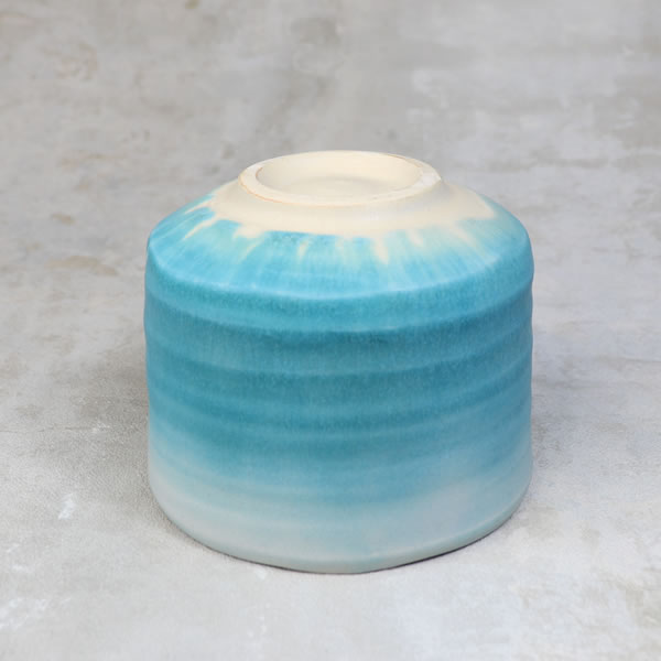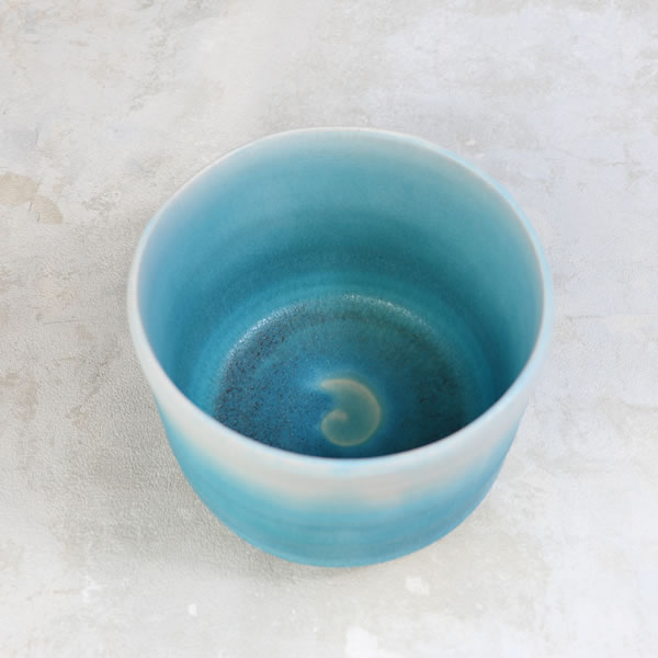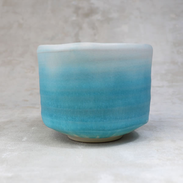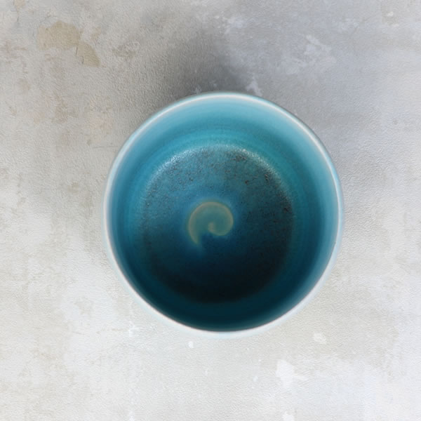 竹村陽太郎 作 「碧釉茶碗」です。ロクロ形成。青一色ではなく口元は薄っすらと白い少し大ぶり茶碗です。 ※ 電子レンジ・食洗機などのご使用はお控えください。