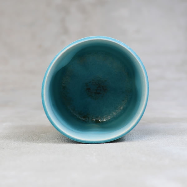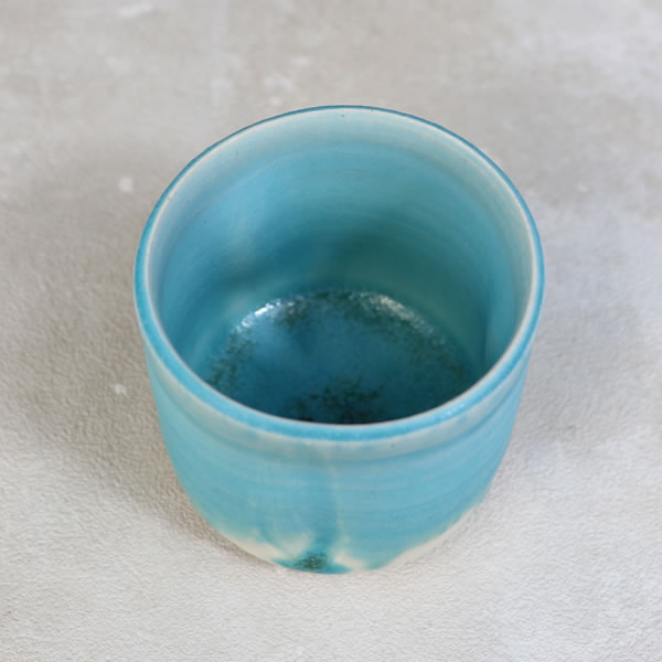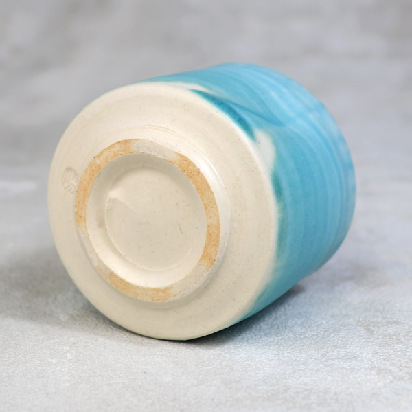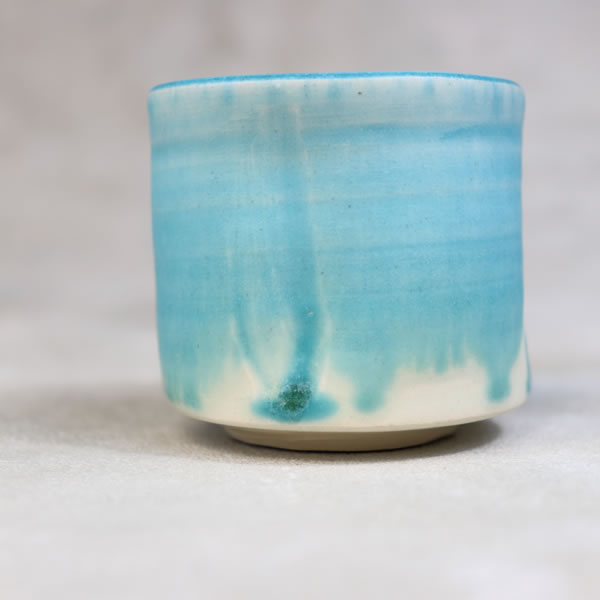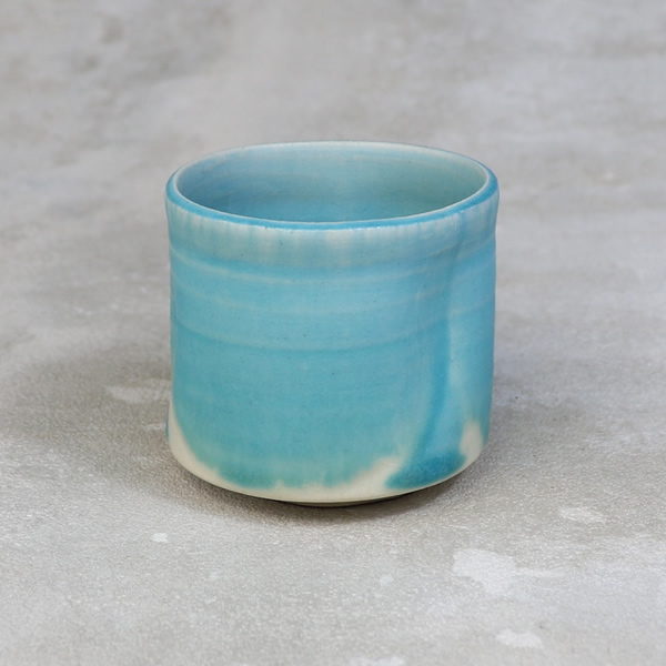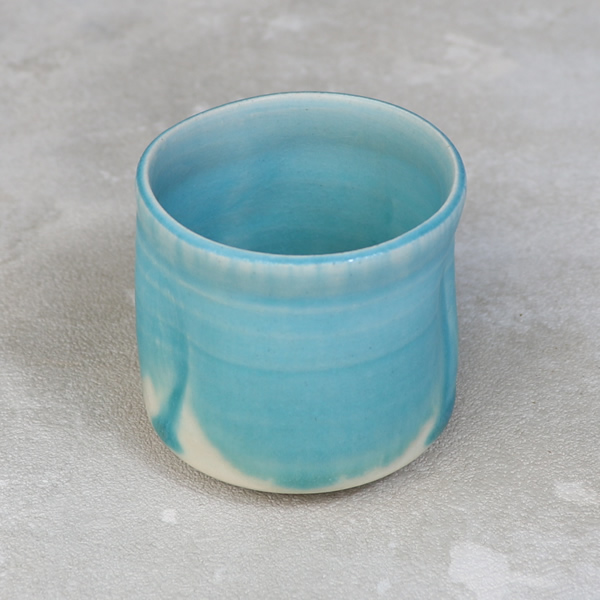 竹村陽太郎 作 「碧釉ぐい呑」です。ロクロ形成。青一色ではなく下の方に流れて白と混ざり合せたぐい呑です。 ※ 電子レンジ・食洗機などのご使用はお控えください。