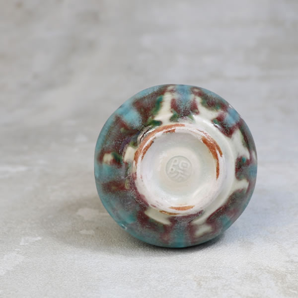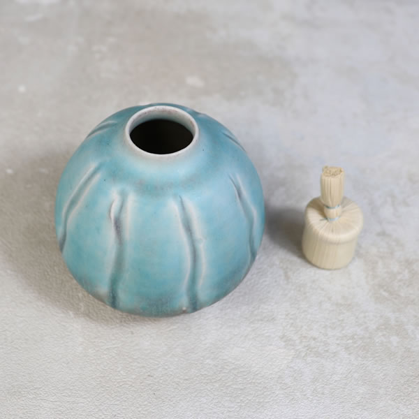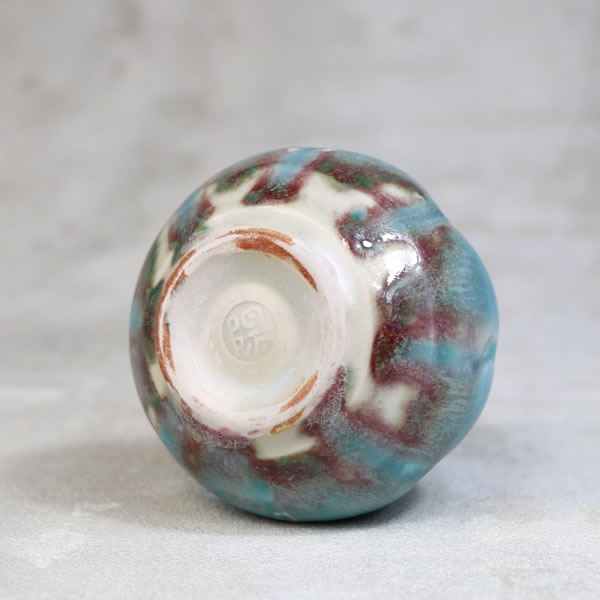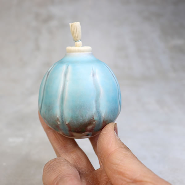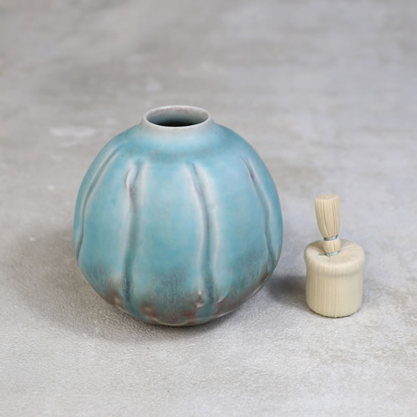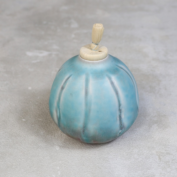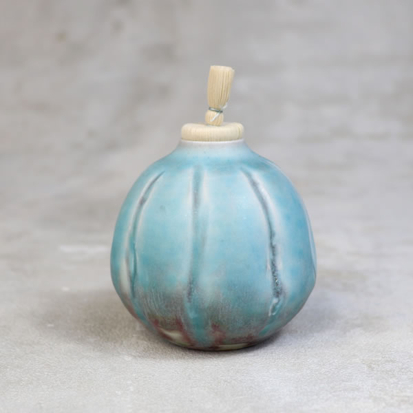 竹村陽太郎 作 「碧釉振出」です。ロクロ形成。青く発色させる為に加えた少量の銅が、少し還元焼成することで青だけではなく、薄っすらと赤く発色させています。蓋を外せますので、花生けなどご自由にお使い下さい。 ※ 電子レンジ・食洗機などのご使用はお控えください。