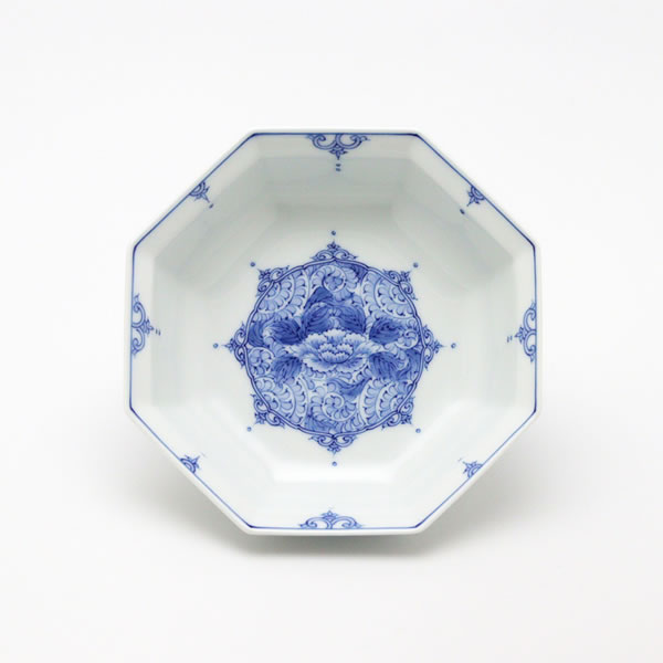 The title is Madori Botan Karakusa Hachikaku Mukozuke (間取牡丹唐草八角向付).