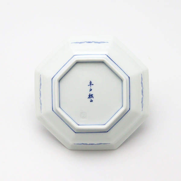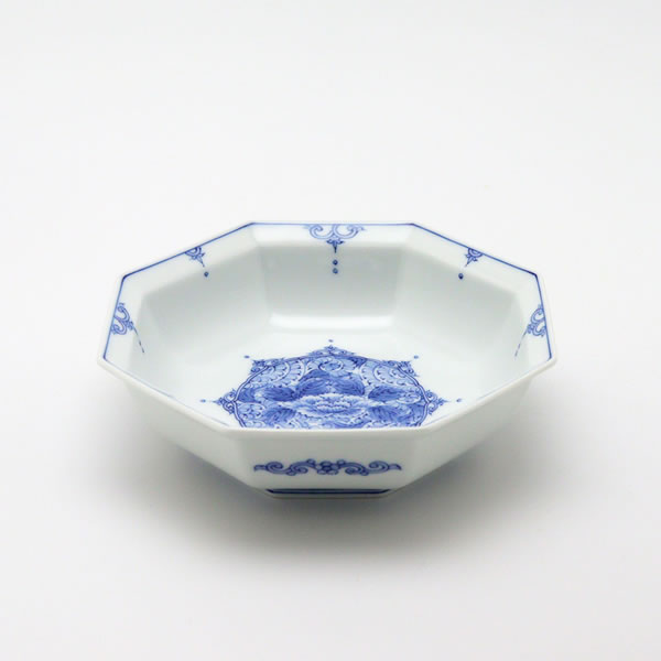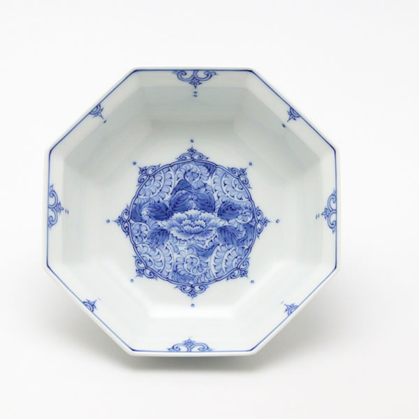 平戸松山窯の「間取牡丹唐草八角向付」です。細かく、しなやかな筆使いで、牡丹と唐草を描き、白磁の白さが優しく感じる作品です。