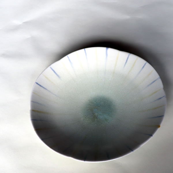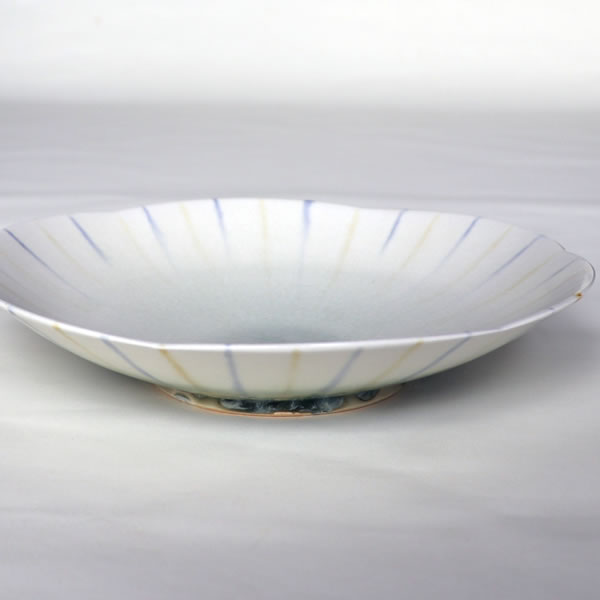 竹村繁男 作 「灰釉三彩鉢」です。無花果(いちじく)の枝を焼いた灰釉です。鉄等の顔料で流れるアクセントにしています。