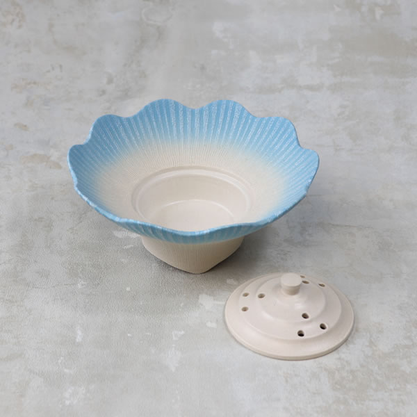 竹村陽太郎 作 「釉泥彩香炉」です。ロクロ形成。青と白のグラデーションに花びらをイメージした香炉です。