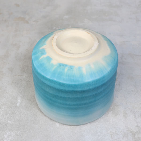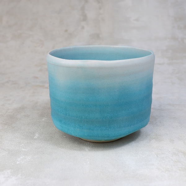 竹村陽太郎 作 「碧釉茶碗」です。ロクロ形成。青一色ではなく口元は薄っすらと白い少し大ぶり茶碗です。 ※ 電子レンジ・食洗機などのご使用はお控えください。