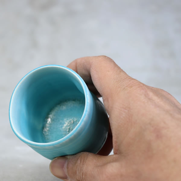 竹村陽太郎 作 「碧釉ぐい呑」です。ロクロ形成。青一色ではなく下の方に流れて白と混ざり合せたぐい呑です。 ※ 電子レンジ・食洗機などのご使用はお控えください。